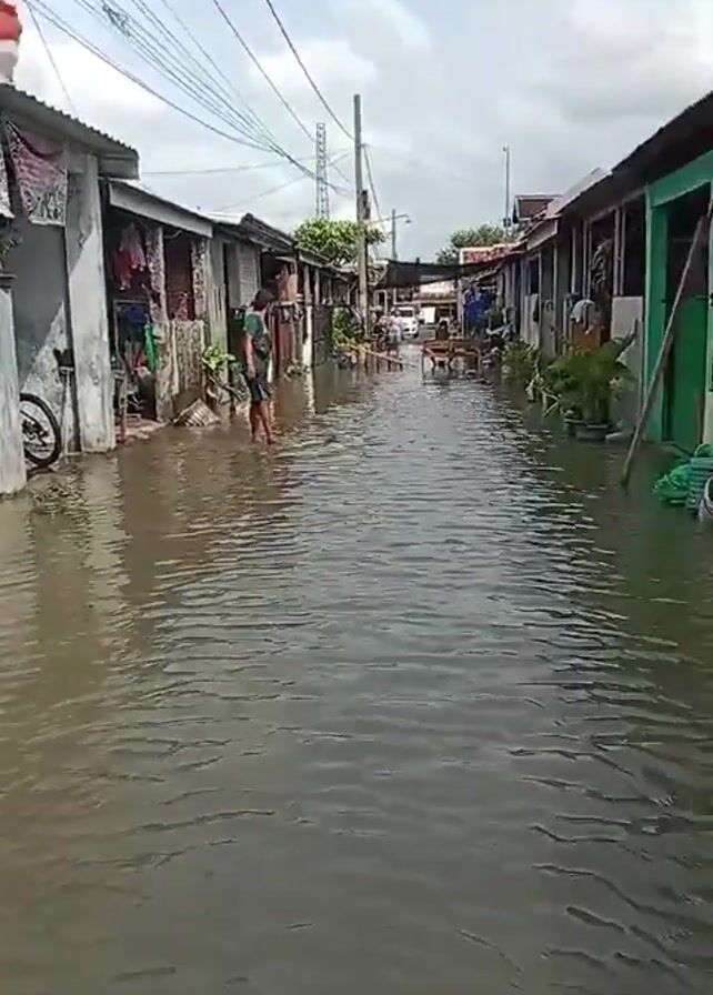 flooded street in a residential area. The water level is high enough to submerge the lower parts of the houses, and a man is wading through the water. Some houses are made of brick and others are painted in green. There are power lines overhead, and a few people are visible further down the street.