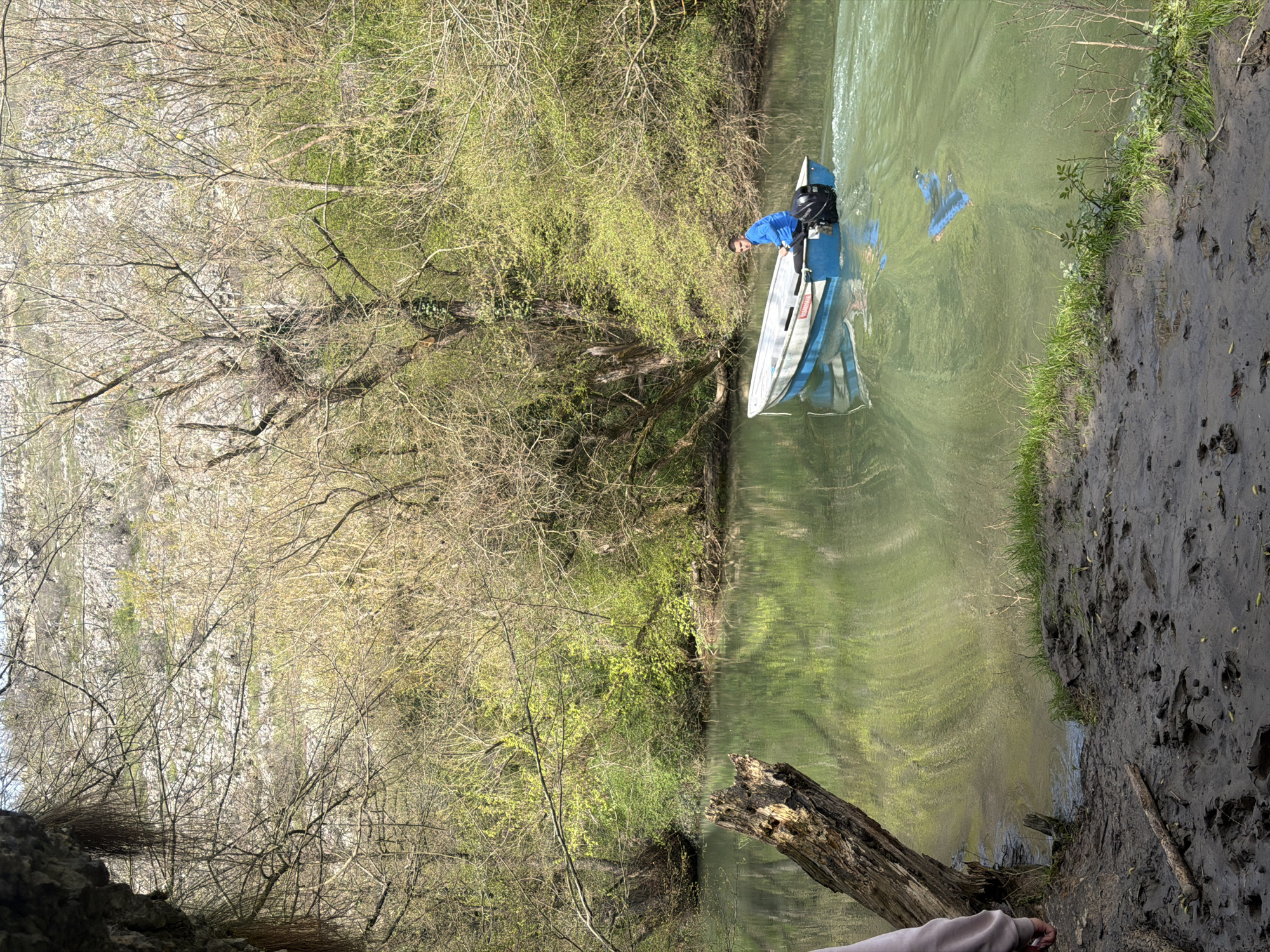 A man in a blue shirt stands in a small blue and silver boat in the Iskar River near Lukovit, Bulgaria. The river is surrounded by trees, and one bank has a muddy edge. The water reflects the sky and trees.