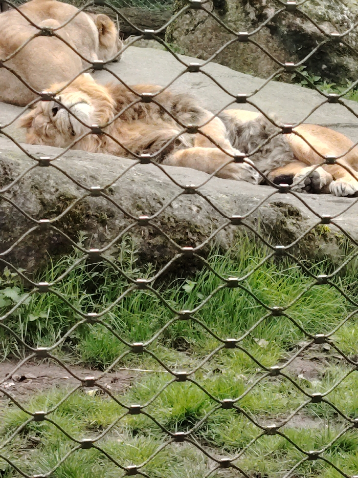 The image displays an outdoor zoo enclosure viewed through a grey metal mesh fence, which is prominently in the foreground and in sharp focus. The fence consists of interwoven cables forming a diamond pattern, secured by small metallic crimps at each junction. Behind the fence, three lions are resting on large, textured grey rocks. A male lion with a tawny, shaggy mane lies in the center, facing the viewer with its head resting on the rock, its eyes appearing closed. To the left and slightly behind the male, a second lion, lighter in fur color and without a visible mane, is partially obscured, showing its hindquarters and back as it rests on an elevated rock. The lower body and paws of a third lion are visible on the rock to the right. The lions' fur color is primarily shades of light brown and tan. Below the rocky elevated area, green grass and patches of brown earth are visible. This scene is located at Diergaarde Blijdorp, Rotterdam, Netherlands.
