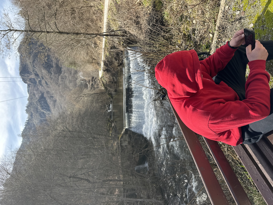 A daylight vertical photograph depicts an outdoor scene in the city of Unknown, Unknown. In the immediate foreground, a person is seated on a dark brown wooden bench, positioned to the lower right. The individual wears a bright red hooded sweatshirt with the hood obscuring their head and face, and dark-colored sweatpants. Their right hand holds a black smartphone, seemingly being interacted with; a black bracelet is visible on their left wrist. Behind the seated individual, a river flows, spanned by a concrete or stone weir that creates a prominent white waterfall across the midground. Turbulent water is visible below the weir. The riverbanks and surrounding hills are covered with bare deciduous trees, indicating a late winter or early spring season. On the right side of the river, a narrow, unpaved or lightly paved road curves into the distance, following the river's course. In the background, steep, rocky mountains rise, also covered sparsely with dormant trees. Overhead, multiple utility lines traverse the sky. The scene is illuminated by direct sunlight from a clear to partly cloudy sky.