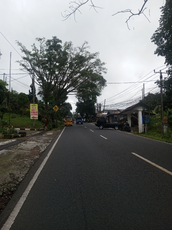 A straight road stretches into the distance on a cloudy day. Various vehicles are present, including a yellow taxi, a blue car, and a small black truck parked on the roadside. A sign directing to "Villa Bukit Lembah Lestari" stands near a person walking. Overhead, a dense canopy of trees intertwines with numerous electrical wires. The road's surface is dark and marked with a white line near the edge, signifying the boundary. Buildings are visible on the right side of the road.