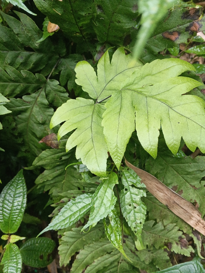 The scene is a close-up, top-down view of dense green foliage located in the city of Bagochen Boolingpang Ueling, Bhutan. A large, prominent, bright green leaf, deeply lobed and appearing wet or glossy, occupies the central and upper-right portion of the frame, displaying distinct venation. Surrounding this central leaf are numerous darker green fern-like leaves, some exhibiting minor brown discoloration or spots. In the lower-left, smaller, textured light green leaves with visible grid-like patterns and some perforations are present. A single elongated, dried, brown leaf lies horizontally in the lower-right quadrant, partially covered by the live vegetation. No people, animals, or artificial structures are visible. The environment is natural and appears damp from recent moisture.