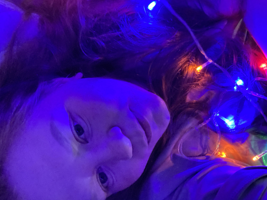 A person's face, tilted upwards, is bathed in blue and purple light. Their hair is dark and blends with shadows. A string of colorful fairy lights, including red, orange, and blue bulbs, snakes through the hair and around the person. The person's eyes are visible, and they appear to be looking directly at the camera. The overall mood is atmospheric and dreamy.