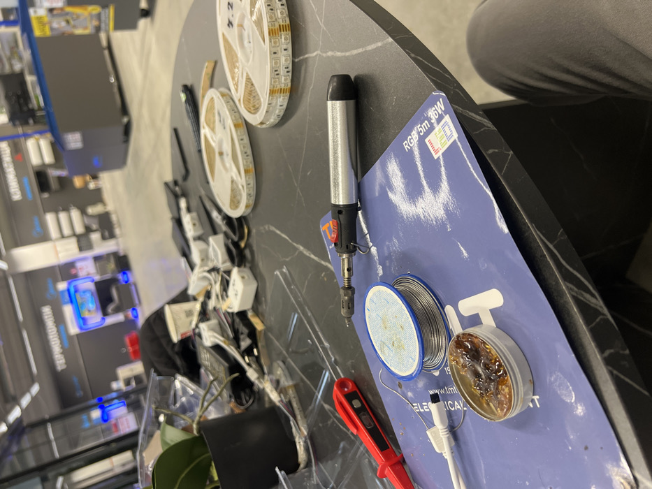 The image depicts a localized workspace on a dark, round, marble-patterned table situated within a large retail electronics and home appliance store in Haskovo, Bulgaria. On the table, a cluster of items suggests an active electronics project. To the left, a black potted plant stands next to a disorganized collection of electronic components, including multiple white plastic multi-plug adapters, various wires, a remote-like device, and a small white paper cup. A pair of black-handled scissors is partially visible among this clutter. On the right side of the table, two coiled spools of LED strip lights are prominently displayed. Beneath some of the tools, a blue/purple cardboard package is visible, bearing the text "RGB 5m 36W." Positioned on this packaging are a silver gas-powered soldering iron with an orange ignition switch, a spool of solder wire with a blue base, and a small metal tin containing dark amber soldering flux. A white USB cable with a male USB-A connector is partially visible, extending onto the packaging. A red handheld voltage tester or multimeter is also present on the table. The lower right corner of the frame shows a portion of a human leg clad in grey trousers, indicating an individual is seated at the table, actively engaged or recently engaged with the components. The background, out of focus, reveals the expansive interior of a retail establishment. Visible elements include commercial display units, various large appliances, and signage in Cyrillic script, including "ТЕРМОПОМПИ" (Heat Pumps), "КЛИМАТИЦИ" (Air Conditioners), and the brand name "Midea." The flooring is light-colored, and the area is illuminated by overhead commercial lighting. The overall environment is consistent with a showroom floor of a large electronics and appliance store.
