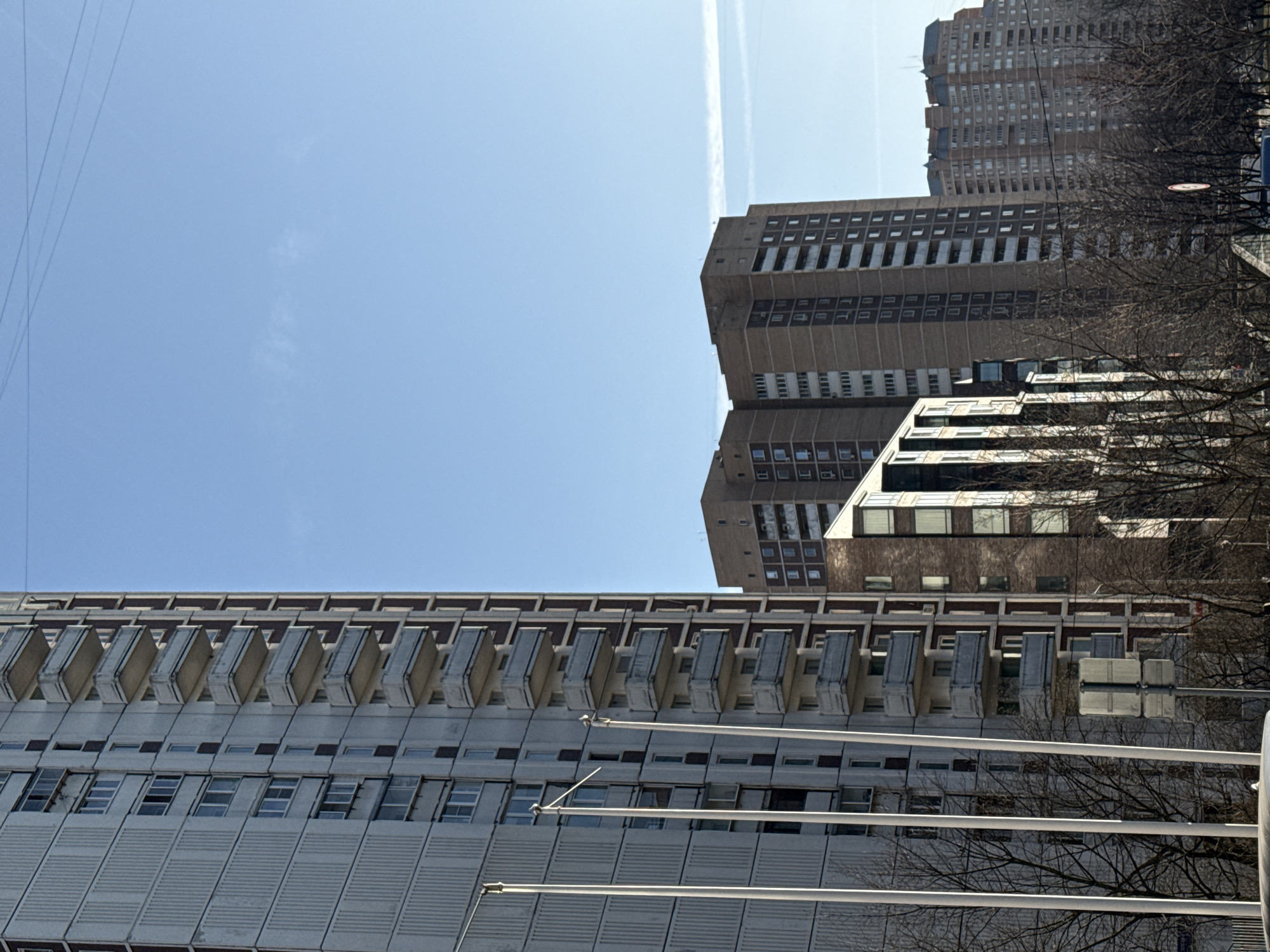 low-angle view of several tall buildings in Reutov, Russia. The sky is light blue with a faint contrail. The buildings have a mix of architectural styles, with one featuring protruding balconies. Bare trees partially obscure the view of the buildings. There are several white poles, seemingly part of a fence or railing, in the foreground. Wires stretch across the upper left corner of the frame.