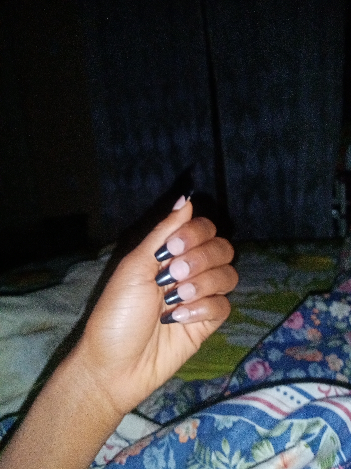 The image displays a human left hand with a medium-dark skin tone, positioned centrally within a low-light environment. The hand's fingers are slightly curled, and the palm is partially visible. The fingernails are manicured, featuring an almond shape with a two-toned French manicure style: a clear or light pink base transitioning to dark, possibly metallic blue or black, tips. The thumb's nail is partially obscured. The immediate background to the left of the hand is dark and indistinct, suggesting a shadow or unlit area. To the right, a patterned fabric, likely a blanket or sheet, is visible. This fabric displays a blue base with white and floral motifs in shades of pink, green, and orange. The overall scene suggests an indoor setting, possibly a bedroom. The image does not contain visual information to confirm a specific location in Dabawa, Nigeria.