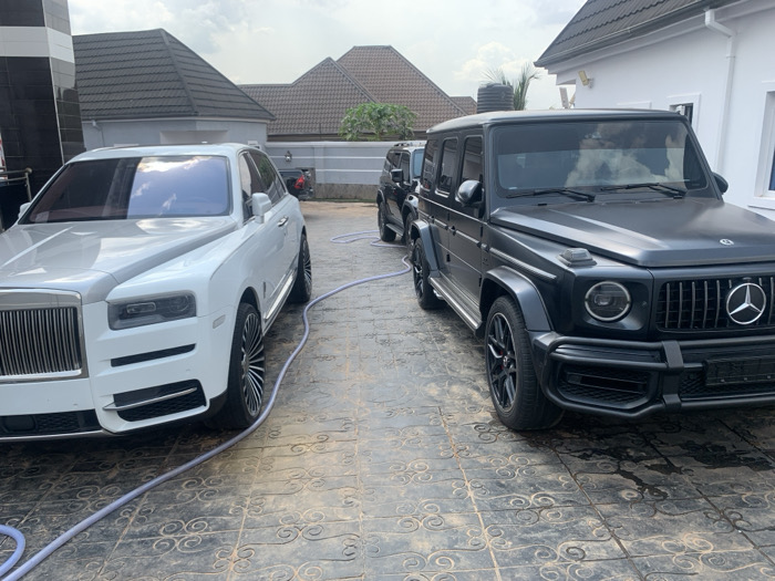 The scene depicts a paved residential courtyard or driveway in Aguleri, Nigeria, under a partly cloudy daytime sky. In the foreground, two luxury sport utility vehicles are parked on dark, patterned pavers that show wet patches. To the left is a white Rolls-Royce Cullinan, its chrome grille facing the viewer, with tinted windows reflecting the sky. To its right stands a matte black Mercedes-Benz G-Wagen (G-Class) with blacked-out components, also featuring tinted windows and visible red brake calipers behind its black wheels. A light-colored hose lies coiled and extended across the pavement between and in front of both vehicles. In the background, a third dark-colored SUV is partially visible behind the Mercedes. Surrounding structures include a modern building to the left with a grey and black striped facade, a larger central building with a complex dark tiled roof, and a white building to the right with a similar roof style and a wall-mounted light fixture. No individuals are visible in the frame.