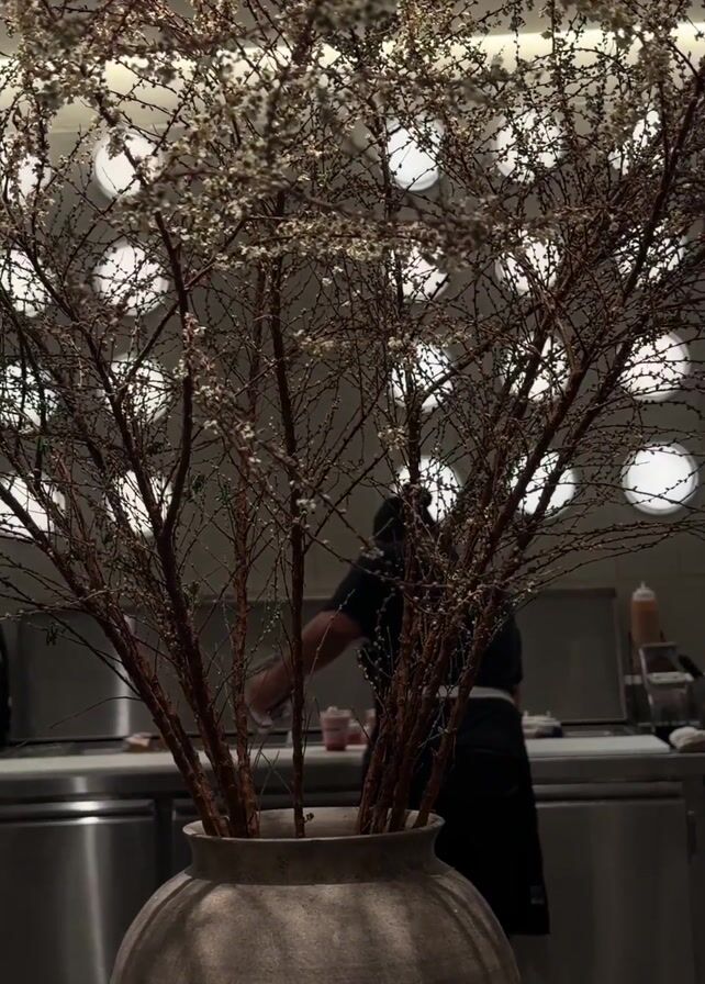 n interior scene featuring a large, round ceramic vase filled with tall, thin, brown branches adorned with small white flowers or buds. The vase is placed in the foreground, obscuring some of the background. Behind the vase, a person in a black uniform and white apron is partially visible working at a stainless steel countertop. Several stainless steel kitchen appliances and containers are also in the background. The lighting appears to be provided by a series of round, evenly spaced lights on the ceiling, creating a patterned effect.