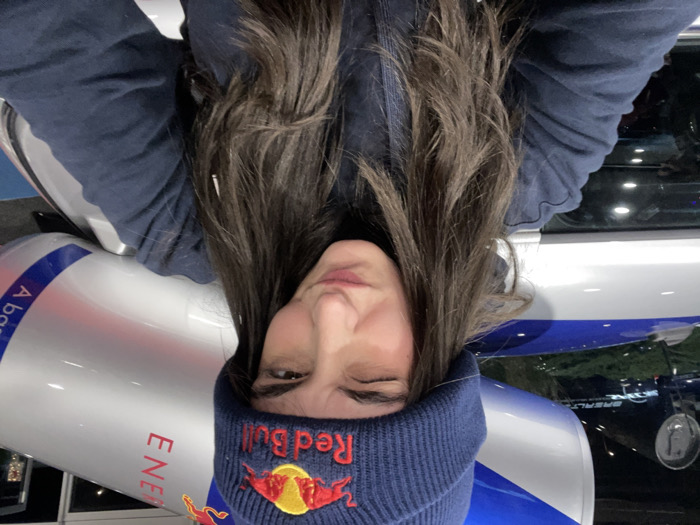 A woman with long brown hair wears a blue Red Bull beanie. She poses upside down, winking. Next to her is a large replica of a Red Bull can, displaying the energy drink's logo and branding. Behind her, partially visible, is a dark vehicle, possibly a car, with its windows reflecting the outside environment. The image has a casual, selfie-style feel.