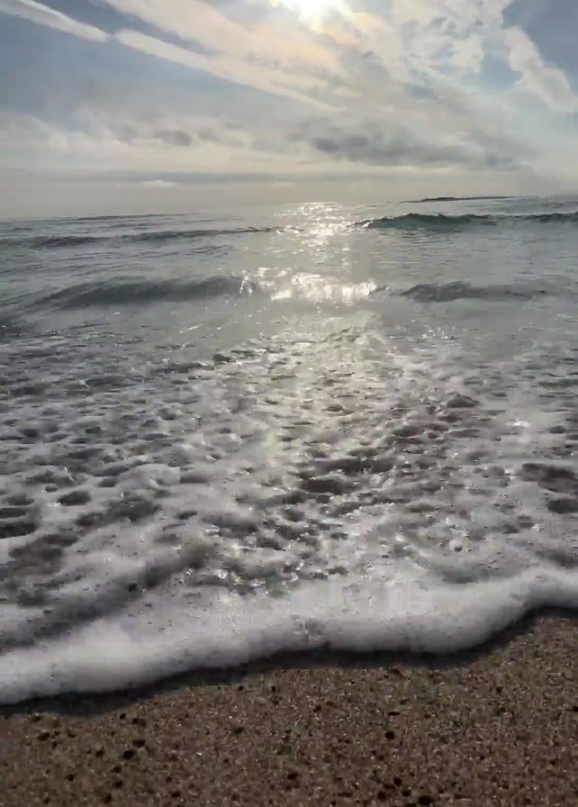 beach on a sunny day with scattered clouds. The waves are gently rolling onto the sandy shore, creating a foamy edge. The sunlight reflects brightly on the water's surface. The beach appears to be made of small pebbles and sand. There are no people visible in the frame. In the distance, a land mass is barely visible. The camera appears to be at a low angle. The camera angle changes slightly.