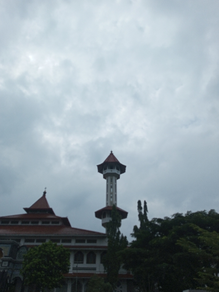 The image depicts an exterior view of a large building complex under an overcast sky. In the foreground, dense green foliage partially obscures the lower sections of the structures. To the left, a multi-story building features white walls and a prominent red-tiled roof with multiple tiers, culminating in a pointed, almost dome-like finial. Several arched windows are visible on the building's facade. Adjacent to and slightly to the right of this building stands a tall, slender minaret-like tower. This tower consists of a central shaft with two distinct sections, each topped with a red-tiled, pagoda-style roof similar to the main building. The upper section of the tower includes an open, multi-arched platform. No people or visible actions are present. The scene is set in the city of Daringbadi, India.