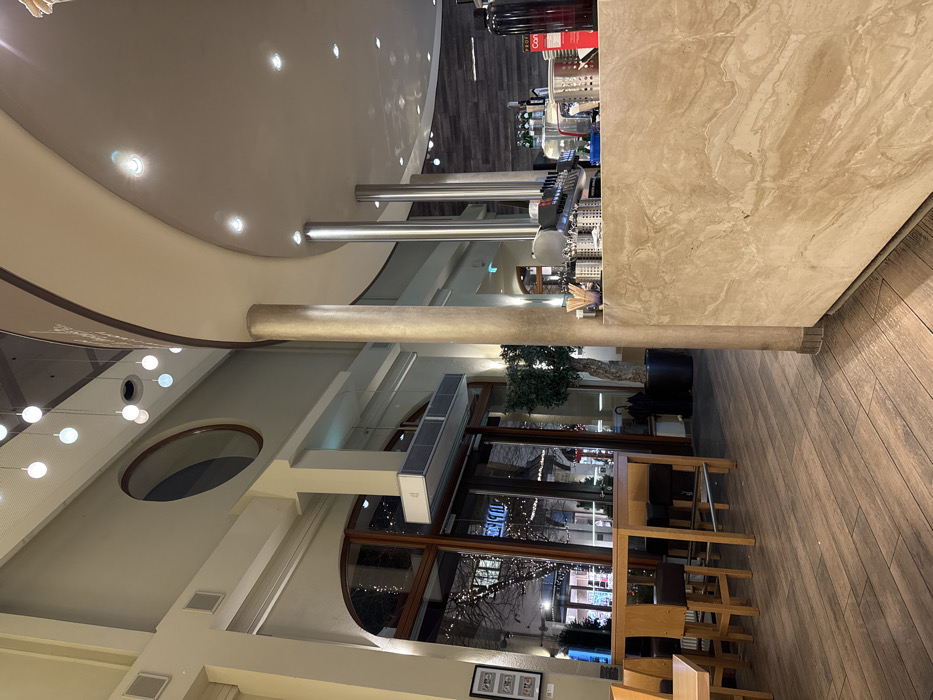 A tilted view inside a building with an elaborate ceiling featuring round lights and a curved design