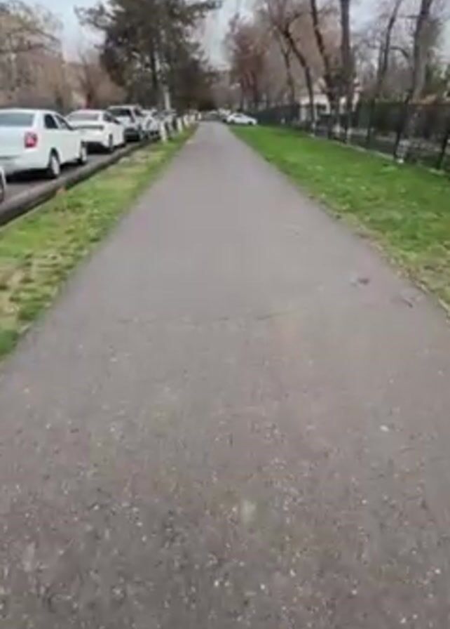 paved path in a city. The path is gray and stretches into the distance. On the left of the path are parked cars and some grass. On the right is a grassy area with trees and a fence. The sky is overcast. The camera is moving forward along the path.
