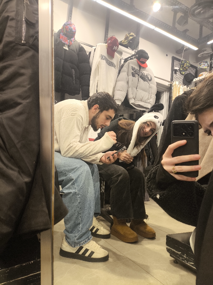 The image captures a reflection in a mirror, depicting an indoor scene within a clothing retail establishment in Strasbourg, France. Three individuals are present. On the far right, partially visible, a person holds a black smartphone with a multi-lens camera array in their right hand, positioned to take the photograph. This individual wears a ring on their right ring finger and dark, textured outerwear over a lighter-colored garment. In the center, a male with dark hair and a beard is seated, wearing a light-colored ribbed long-sleeve shirt, light blue loose-fitting jeans, and white sneakers with three black stripes and a black sole. He is leaning forward, focused on a smartphone held in his hands. Adjacent to the male, a female is seated, wearing a white novelty hat with panda ears, a dark long-sleeve top, dark loose-fitting pants, and light brown platform boots. She holds a dark object in her hands and is looking towards the camera with a slight smile. The background, visible through the mirror's reflection, consists of white walls and overhead fluorescent lighting. Various clothing items are displayed on racks and shelves, including a black puffer jacket, a white ribbed sweater with a dark pattern, a light grey puffer jacket with "Chicago" text, and several baseball caps in colors such as red and camouflage. A dark garment is visible on the extreme left, partially obscuring the mirror's edge.