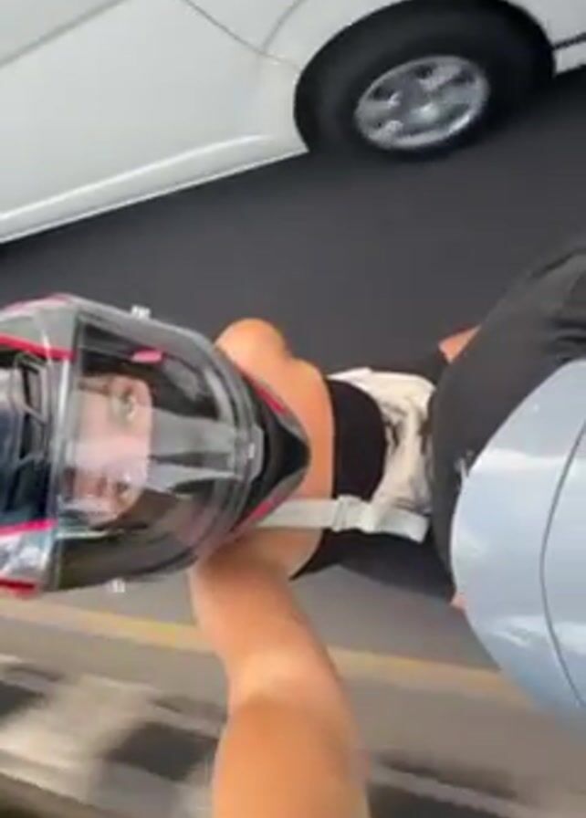 A person wearing a black helmet with red, white, and blue stripes is being recorded in first person on what appears to be a moving motorcycle, as cars and roadside foliage pass by. The person recording has their left arm extended out and is holding onto the helmet of the person in front of them. The person in front of them is also wearing a helmet and is seated on the motorcycle, in front of the person recording. The camera is angled slightly downward, showing the road and the surrounding environment. The recording is somewhat unstable, likely due to the movement of the motorcycle.