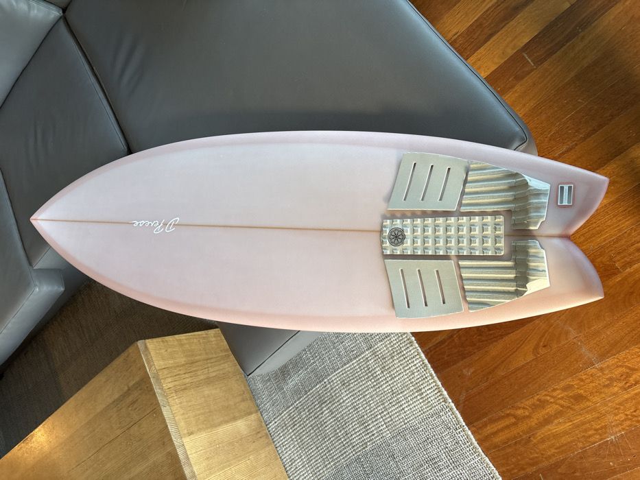 A light pink surfboard rests on a gray leather couch and a tan wooden table. The board features a split tail and a centrally located traction pad. The traction pad is gray and consists of a diamond-patterned central piece flanked by grooved sections with parallel slots. "J. Preese" is written in cursive on the top left of the board. The surrounding area consists of a tan-colored rug and hardwood floors.