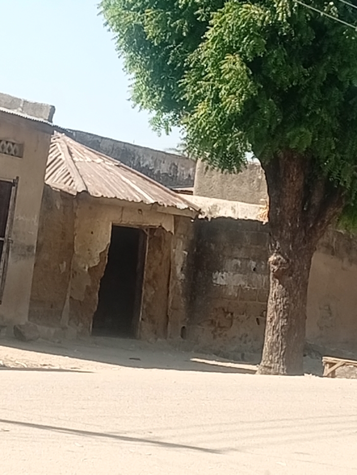 The scene, set in Sumaila, Nigeria, captures a sunlit, unpaved area adjacent to several weathered structures and a large tree