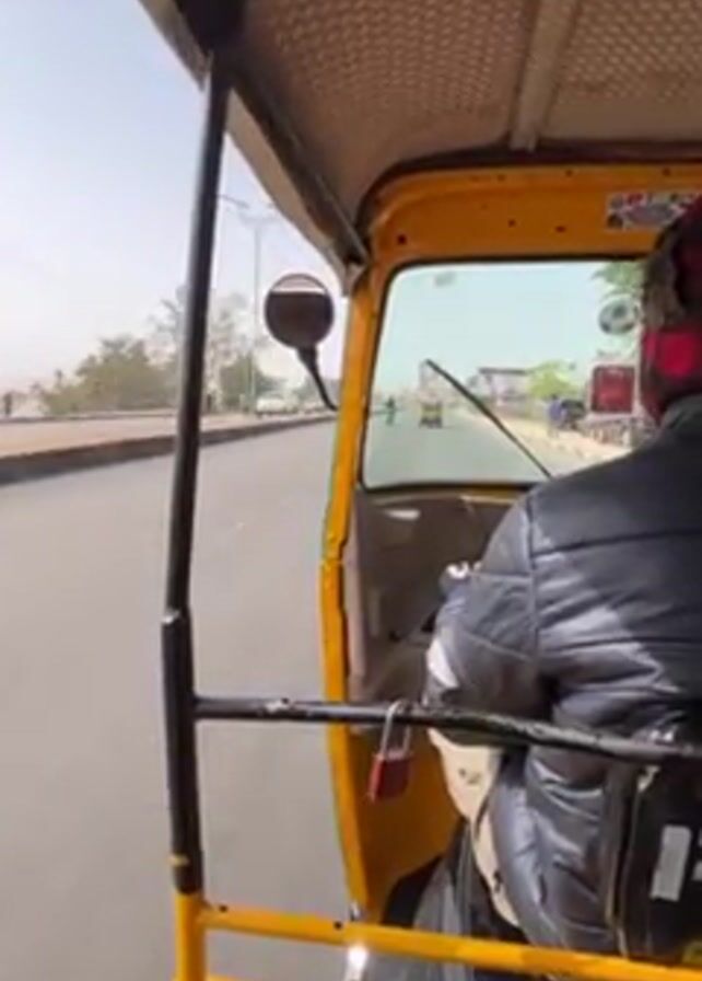 view from inside a yellow and green auto rickshaw moving along a paved road. The driver, wearing a dark jacket and what appears to be a red head covering, is visible in the driver's seat. Other vehicles are visible on the road ahead and to the side. The sky is bright, and there appear to be trees and buildings along the side of the road. There's a small mirror attached to the side of the auto rickshaw, and a padlock is visible on the door frame.