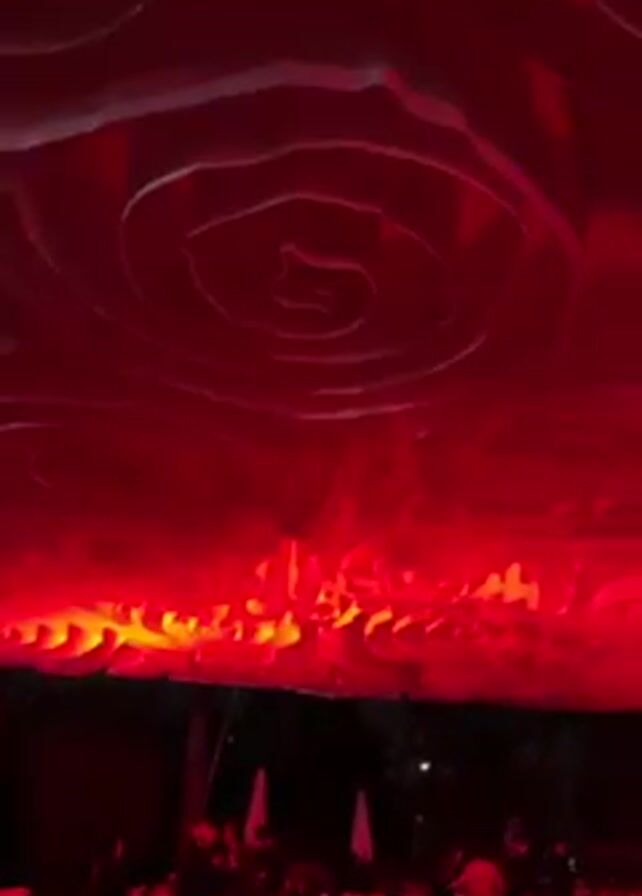ceiling decoration of large, rose-like shapes, illuminated in red