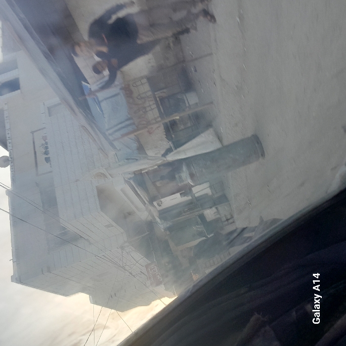 An urban scene appears blurred and tilted, likely viewed through a vehicle window. A white building with multiple floors is visible on the left. Various objects sit in front of the building, partially obscured. A gray cylindrical object lies on the ground. A small person can be seen on the ground.