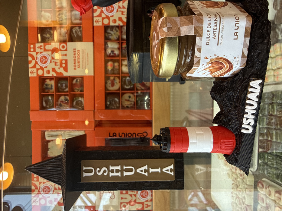 The image displays a clear glass display case featuring confectionery and souvenir items within a retail establishment. In the foreground, from left to right, are three primary objects: a dark, textured, tapered column approximately 25 cm tall, with the white word "USHUAIA" embossed vertically on a brown plaque; a miniature, approximately 8 cm tall, red and white striped lighthouse replica situated on a black textured base, which also bears the white word "USHUAIA" horizontally; and a small glass jar with a golden lid containing dulce de leche. The jar's label reads "DULCE DE LECHE ARTESANAL," "TOLHUIN - TIERRA DEL FUEGO," and "LA UNION." The background, visible through the display glass, consists of neatly stacked orange cardboard boxes containing "BOMBONES SURTIDOS" (assorted chocolates), identified with the "LA UNION" brand. The boxes feature decorative patterns including animal and tree silhouettes. Multiple reflections of warm-toned overhead lighting are present on the glass surface. The setting is identified as Tolhuin, Tierra del Fuego, Argentina, based on the product labeling. No individuals are depicted in the scene.