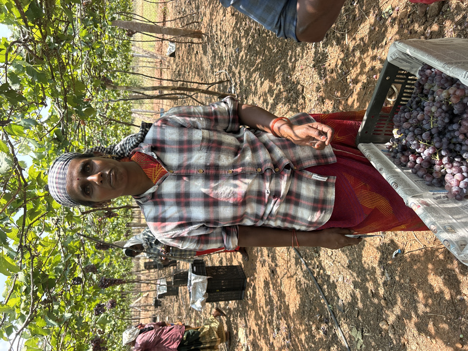 The image depicts a grape harvesting scene in a vineyard located in Chinnalapatti, India