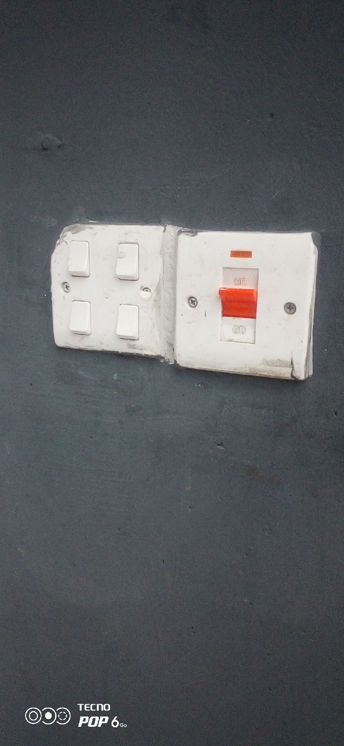 The image displays two adjacent, white electrical wall units mounted on a dark grey, textured wall. The unit on the left features four small, rectangular white toggle switches arranged in a 2x2 grid. The unit on the right contains a single, larger, rectangular orange toggle switch, currently positioned in the "OFF" configuration, with "off" text visible above the switch and "on" text below it. A small orange indicator mark is present above the "off" text. Both electrical units are secured to the wall with visible silver Phillips head screws and exhibit signs of wear, including minor chips, scuffs, and grey sealant residue along their edges where they meet the wall. The dark grey wall appears to be painted or plastered, showing slight irregularities and minor surface imperfections. There are no individuals, animals, or other significant objects or actions depicted in the scene. A "TECNO POP 6 Go" watermark is visible in the bottom left corner of the image. The location is an interior space in the city of Unknown, Unknown.