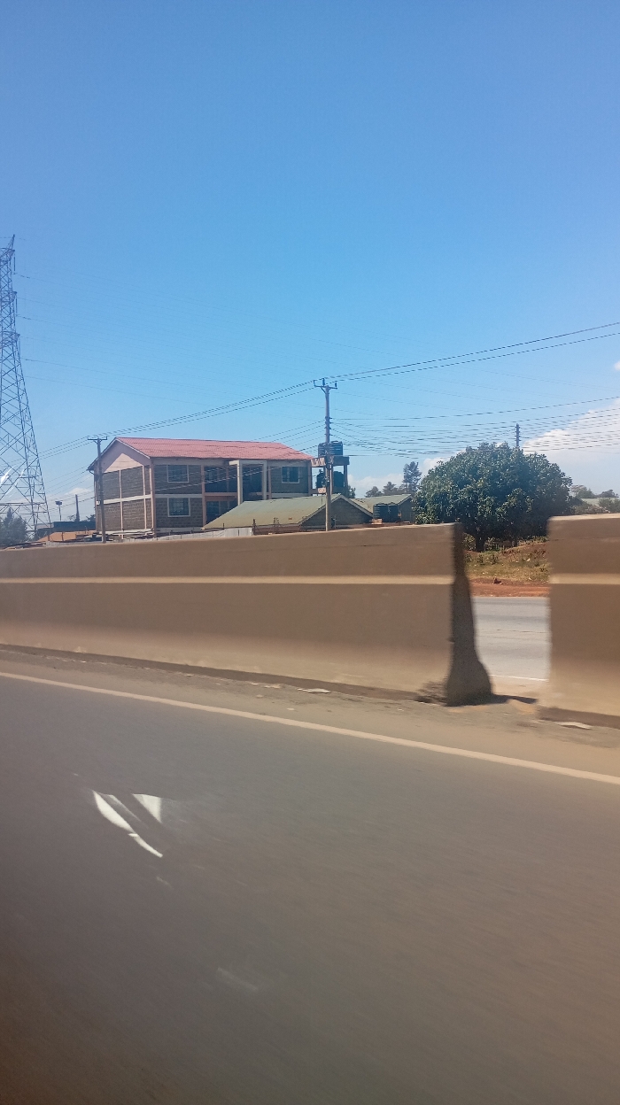 A two-story building with a red roof is visible beyond a concrete barrier and a stretch of asphalt