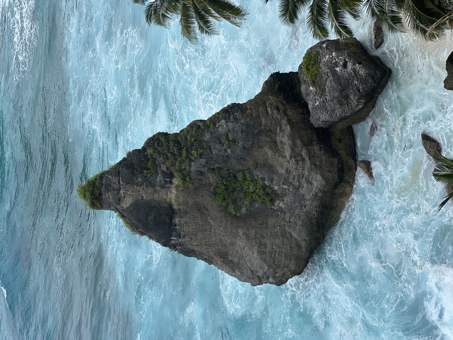 A large, dark gray rock formation rises from the turquoise ocean. Green vegetation clings to its surface. Another, smaller rock rests adjacent to the larger one. Palm tree fronds frame the top of the image. White waves churn around the rocks, contrasting the dark rock and clear water.