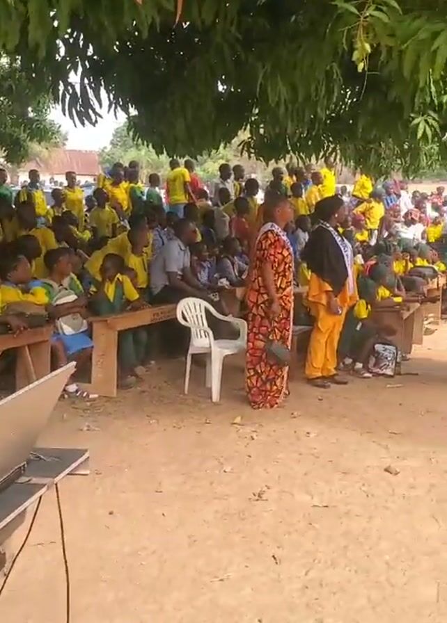 crowd gathered outdoors, likely at a school or community event. Many people are wearing yellow shirts, presumably school uniforms, and are seated on benches. A laptop sits on a metal table in the foreground, suggesting a presentation or speech may be taking place. Several adults are standing and appear to be organizing the event, interacting with people in the crowd. The event is taking place under the shade of a large tree, and the ground is sandy.