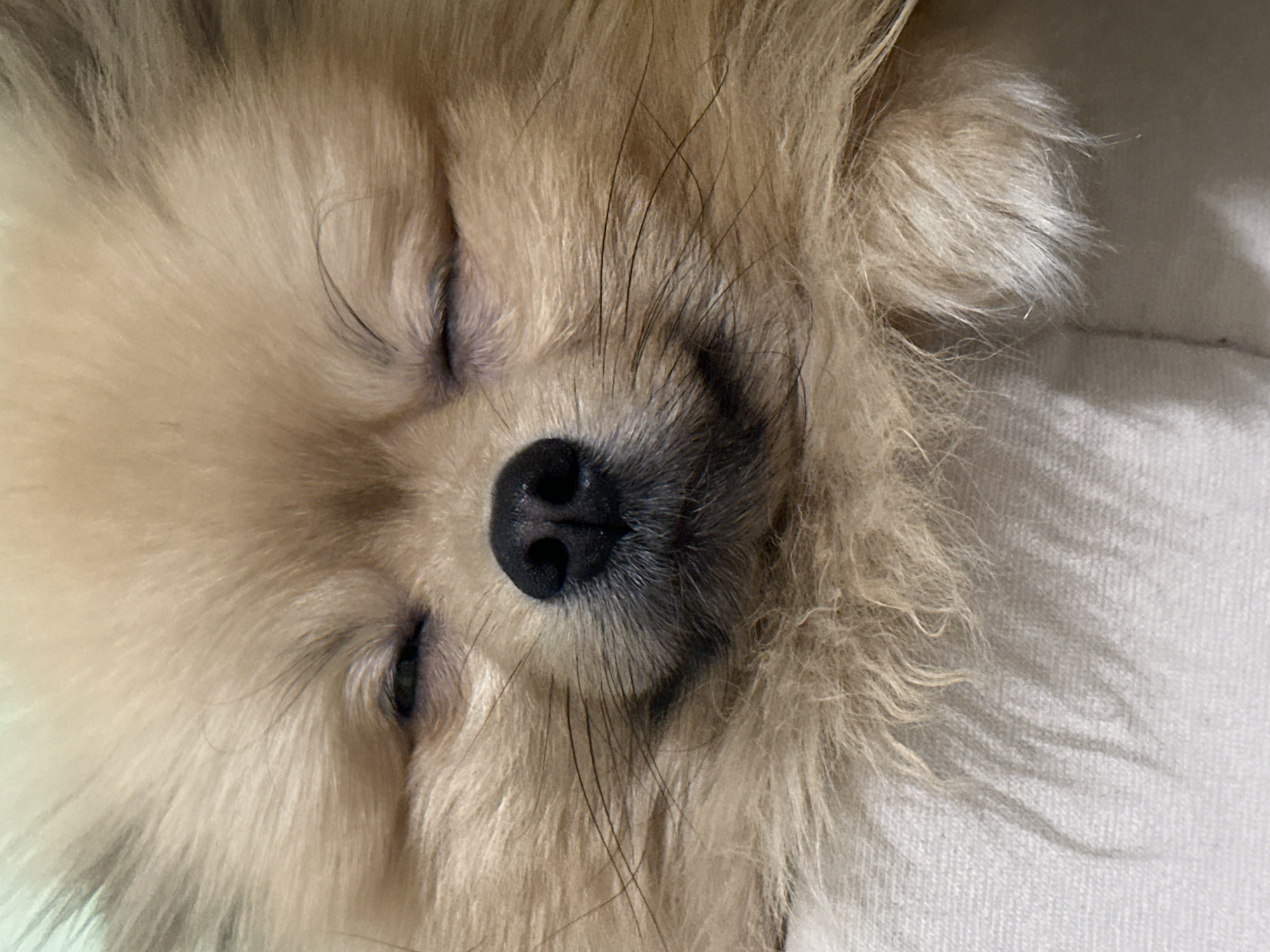 A close-up photograph shows a fluffy, light brown Pomeranian dog sleeping