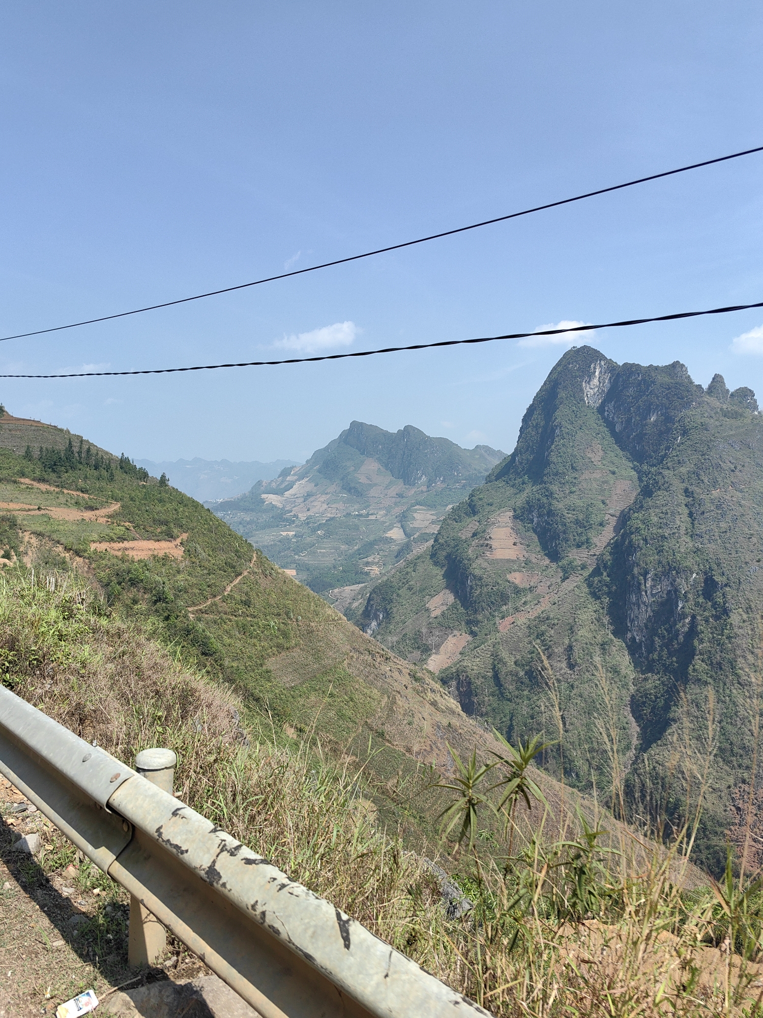 The image captures a mountainous landscape in Lũng Cú Commune, Vietnam. In the foreground, a weathered metal guardrail runs along the edge of a road. Tall grasses and small plants grow along the roadside. Beyond the immediate foreground, a deep valley stretches between rolling hills and mountains. The mountains are covered in vegetation, with some areas showing signs of terraced farming. Electrical lines stretch across the upper portion of the frame. The sky above is clear and blue.