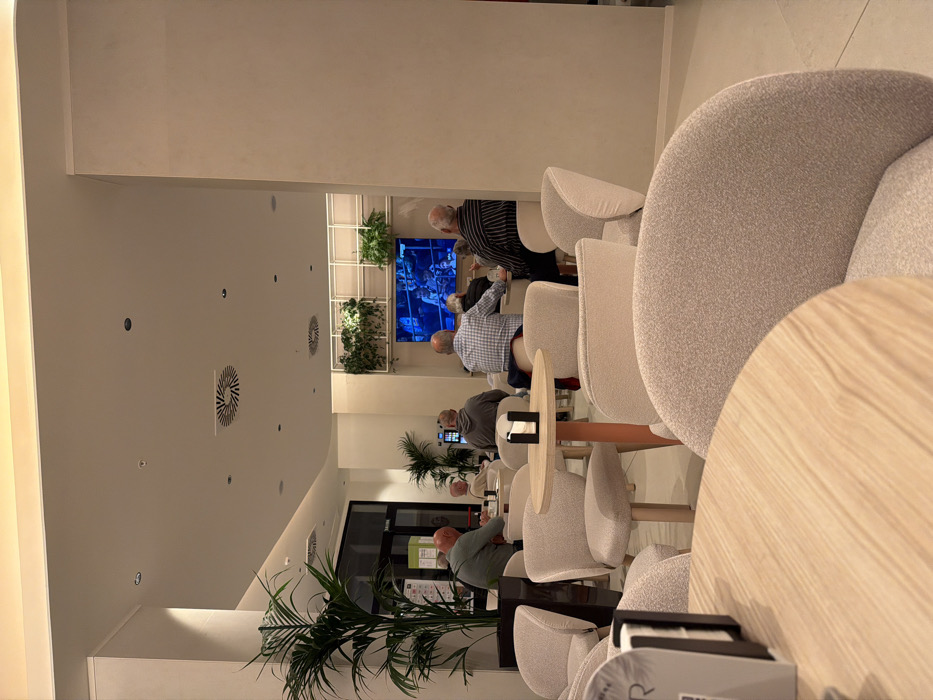 The image depicts an interior scene within a modern hotel lobby or lounge area in Gandia, Spain. The environment features light-colored walls and flooring, with ambient lighting provided by recessed ceiling fixtures and several circular air vents. Approximately 7-8 adult males, appearing to be middle-aged or elderly, are present. Most individuals are seated in light-colored, upholstered armchairs at round, light wood tables, with their backs generally oriented towards the viewer. Their collective gaze is directed towards a large, wall-mounted television screen located at the far end of the room. The television displays what appears to be a live sporting event, showing a boxing or wrestling ring with figures inside. Specific individuals visible include: a man in a light green/grey long-sleeved shirt seated on the far left, partially obscured by a tall potted palm plant; a balding man in a grey hoodie; a man with grey hair in a light blue checkered shirt; and a man with white hair wearing a dark striped shirt. Other individuals are partially visible or less distinct in the background. In the immediate foreground, a light wood round table and the back of an upholstered armchair are out of focus. Another similar table with an orange-colored base and a black napkin holder is centrally placed in the mid-ground. Additional potted plants are positioned above and around the television. A black-framed glass door is visible on the left side of the room. The overall scene suggests a casual gathering of individuals watching television in a communal lounge setting.