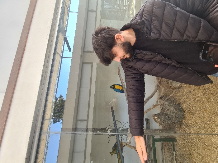 A male subject is depicted observing an animal enclosure in Barza Municipality, Syria. The subject, an adult male with dark hair and a beard, is seen from the chest up, wearing a black puffer jacket over a black sweater. He holds a dark-colored smartphone in his left hand. His right arm is extended horizontally, with the open palm pressed against a clear glass barrier, as he looks intently into the enclosure to his right. Inside the glass-fronted enclosure, at least two parrots are visible. A prominent blue and gold macaw is perched on a natural branch in the mid-ground, facing left. Further to the left, a second parrot with yellow and green plumage is perched on a higher branch. The floor of the enclosure is covered with light-colored wood shavings. Several other natural branches and tree stumps are present, providing perching and climbing structures. A small, dark green wooden bench or platform is visible on the left side of the enclosure. Reflections in the glass barrier show a clear blue sky and tree foliage, suggesting an outdoor environment or a window opposite the enclosure. The structure above the glass features a light-colored wall and a brown trim, indicating an indoor viewing area.