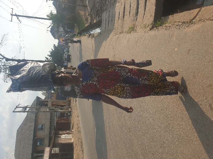 A woman walks along a paved road carrying a large bundle on her head. She wears a colorful patterned dress and sandals, with one arm extended. A dark shadow stretches onto the road beside her. Behind her are buildings, power lines, and glimpses of vehicles on the street. A drainage ditch runs parallel to the road. The sky is visible in the background, suggesting an outdoor setting in an urban or semi-urban area.