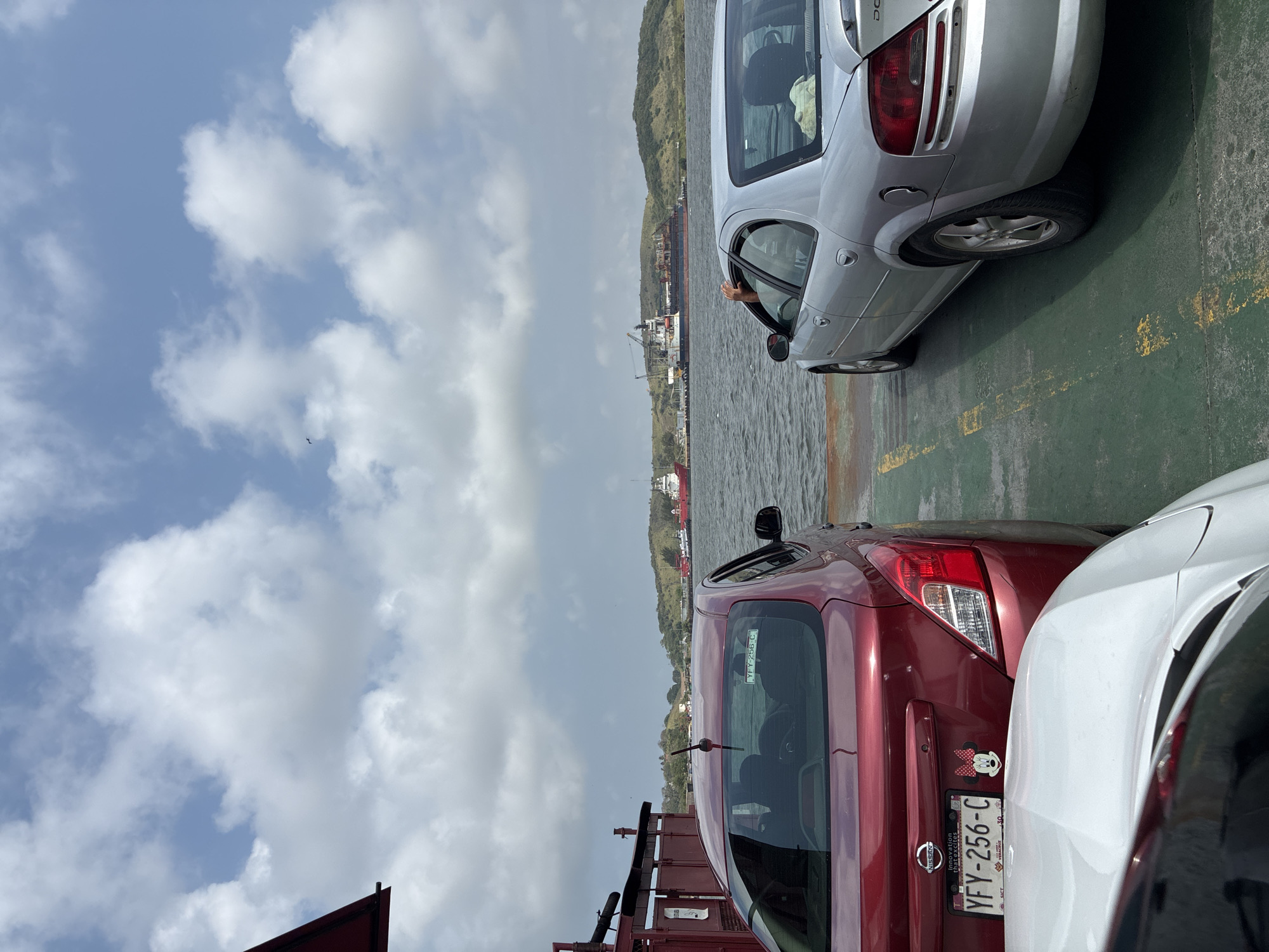 The image, taken from what appears to be a ferry, depicts cars parked close together, likely for transport across a body of water