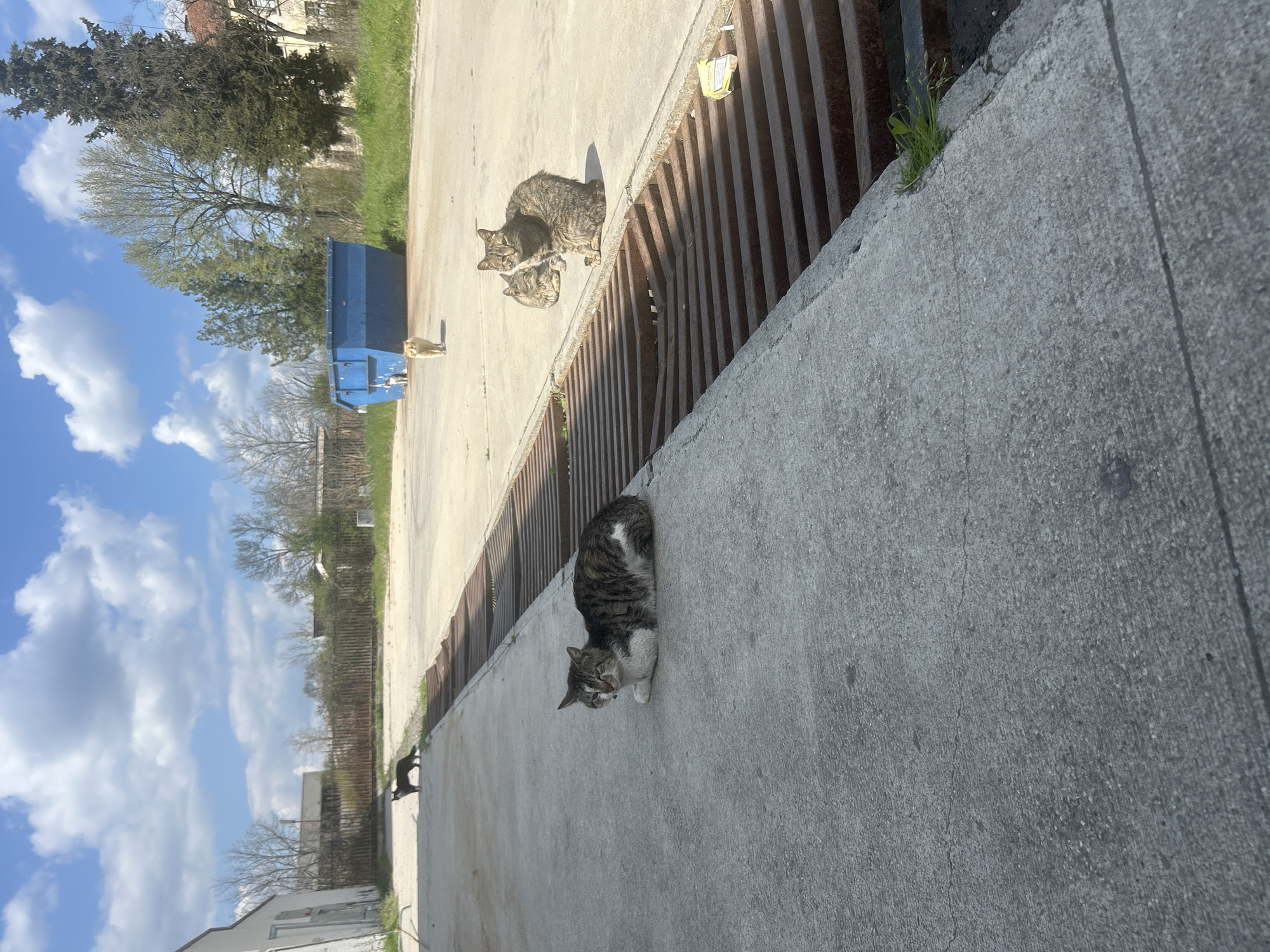 concrete area next to a metal grate. Three cats are visible: two huddled together near the grate and one further away. In the background, there's a blue dumpster, grass, trees, and a building. A fourth cat can be seen walking away in the foreground. The image was taken in Harmanli, Bulgaria.