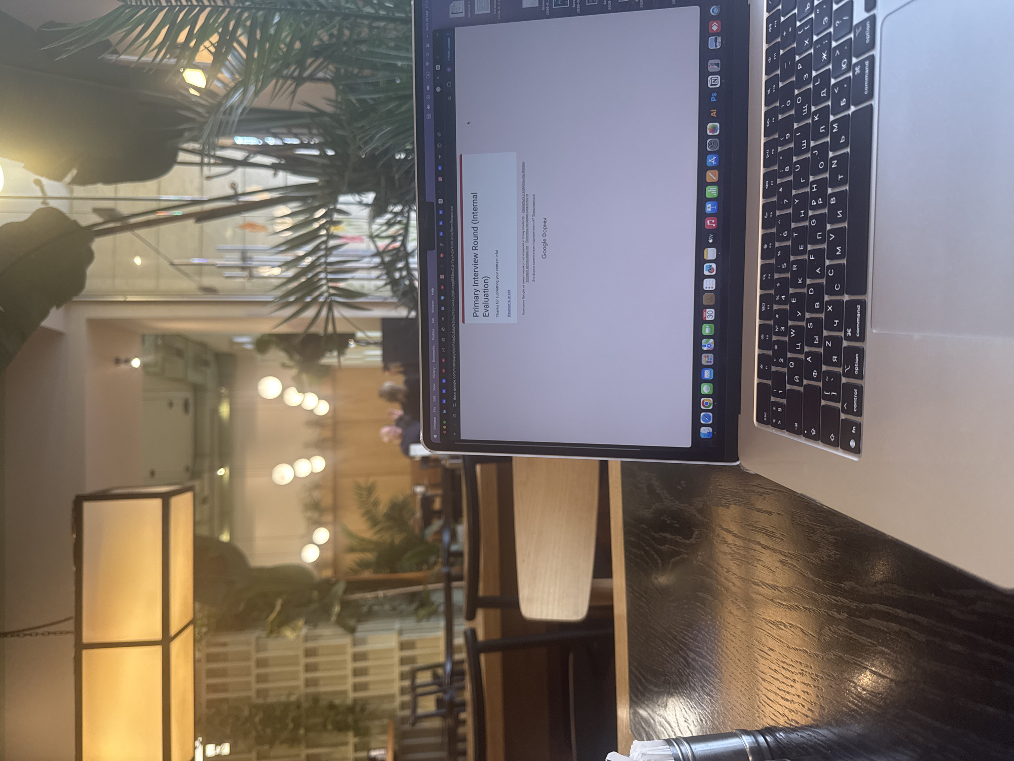 A laptop is open on a dark wooden table, displaying a Google Forms survey titled "Primary Interview Round (Internal Evaluation)". The keyboard has both English and Cyrillic characters. In the background, through what appears to be a glass wall, is an indoor space with lighting fixtures and plants, suggesting a cafe or restaurant setting. A lamp is visible in the foreground. The location appears to be a cafe or restaurant in Yerevan, Armenia.