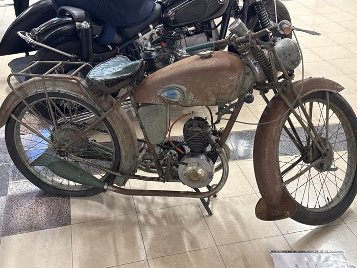 An old, rusted motorcycle is the central focus. The bike features a single-cylinder engine, a simple frame, and weathered fenders. The seat is partially torn and faded. Rusted metal components are noticeable across the motorcycle. It sits on a checkered tiled floor. A newer, black motorcycle is partially visible in the background. The overall condition suggests it is a vintage vehicle.
