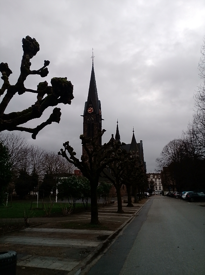 The image depicts an overcast daytime scene in Schiltigheim, France, centered on a large, dark-colored Gothic Revival church. The church features a prominent, tall steeple topped with a cross and weather vane, and at least one visible clock face with red hands and Roman numerals. Several smaller spires are visible along the church's roofline to the right of the main steeple. In the foreground and mid-ground, multiple deciduous trees, severely pollarded and bare of leaves, are present; a large, gnarled branch extends from the upper left. A paved road or street runs from the foreground to the background on the right, bordered by a pedestrian path or sidewalk on the left. A row of parked vehicles, including white, blue, and dark-colored cars, occupies the right side of the road in the mid-ground. Beyond the cars, a multi-story building with a light-colored facade is visible. A green space with bare trees and shrubs occupies the left side of the frame. The sky is uniformly grey and overcast. No individuals are visible.
