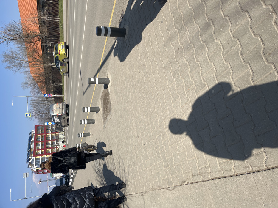 The scene depicts a sunny urban street view on Bul. "Dragan Tsankov" 36 in Sofia, Bulgaria, characterized by a modern residential or office building with a red and yellow facade and rooftop solar panels. In the immediate foreground, the shadow of a human figure, presumed to be the photographer, is cast prominently on a gray interlocking paver sidewalk. To the left, a partial view of a second person, wearing a dark padded coat and dark trousers, is visible walking away from the camera. A third person, wearing a black fur-trimmed coat, black trousers, black boots, and a black backpack, is walking away in the middle distance, carrying a brown object in their right hand. The sidewalk is delineated by a row of black bollards with white reflective stripes. Beyond the bollards lies a multi-lane asphalt road with clear white and yellow markings. A gray commercial van with visible side graphics is driving away in the right lane, followed by a yellow Kia Ceed taxi with visible taxi livery in the left lane. Across the road, the distinctive red and yellow building with solar panels on its roof is visible. To its right, a long, low-rise building with a dark facade and an orange-brown tiled roof stands, alongside a sparse line of bare trees. Multiple streetlights and various traffic signs, including a pedestrian crossing sign and directional signs, are present. Two large construction cranes are visible against the clear blue sky in the far left background, indicating ongoing development in the area. The ambient light suggests midday conditions with strong shadows.