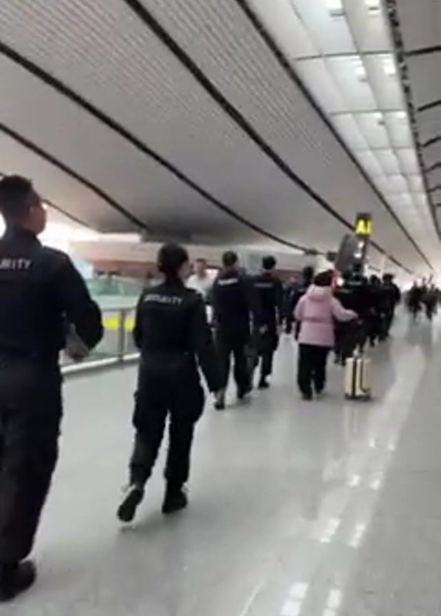 Several uniformed security personnel are walking through a large airport terminal