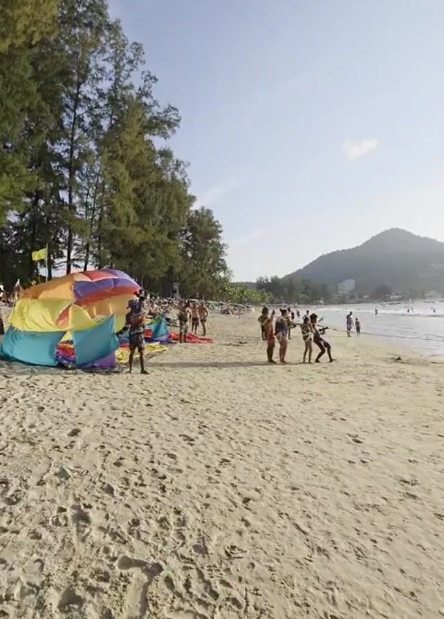 On a sandy beach, a group of people launches a large, colorful parachute-like structure into the air. The structure is predominantly composed of rainbow-colored panels. The beach is wide and sandy, with the ocean visible in the background. Scattered individuals are present on the beach and along the shoreline. Trees border the beach on one side, and a hill or mountain can be seen in the distance. The sky is blue with scattered clouds, and the sun appears to be shining brightly, creating a slightly overexposed effect in the video. The atmosphere suggests a recreational or tourist setting.