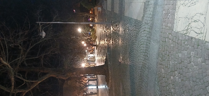 A night scene depicts a cobblestone pavement leading to a distant, illuminated area. Bare trees flank the left side of the path, with a lamppost extending over them. The wet pavement reflects the ambient lights, creating a blurred, shimmering effect. A section of marble or concrete tile is visible on the right. The overall mood is dark and atmospheric.