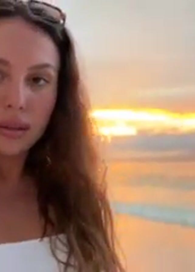A woman is taking a selfie on a beach. She is wearing a white top and has sunglasses perched on her head. She then puts on the sunglasses and winks at the camera. The background features a picturesque beach scene with white sand, clear water, and a colorful sunset. Other people are visible in the background enjoying the beach.