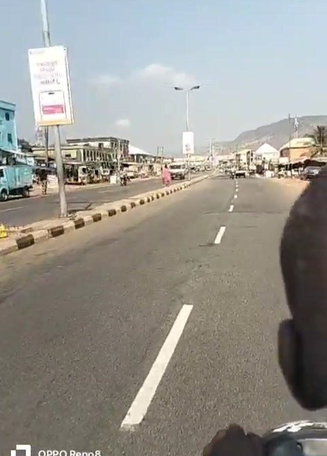 view from the back of a moving motorcycle traveling along a road. The road has two lanes separated by a white line. On the left side of the road, there is a sidewalk and buildings, with some people walking around. There are also some vehicles parked along the side of the road. There are streetlights along the road with advertisements on them. In the distance, there are hills. The sky is blue with some clouds. The person recording the video is wearing a dark-colored shirt.