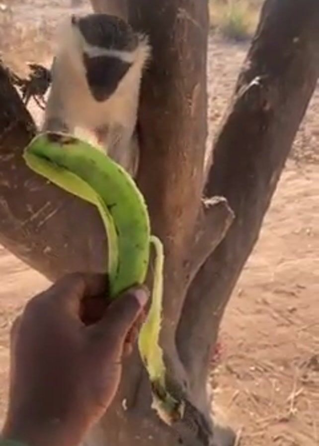 A person is holding a green banana to a small monkey sitting in a tree