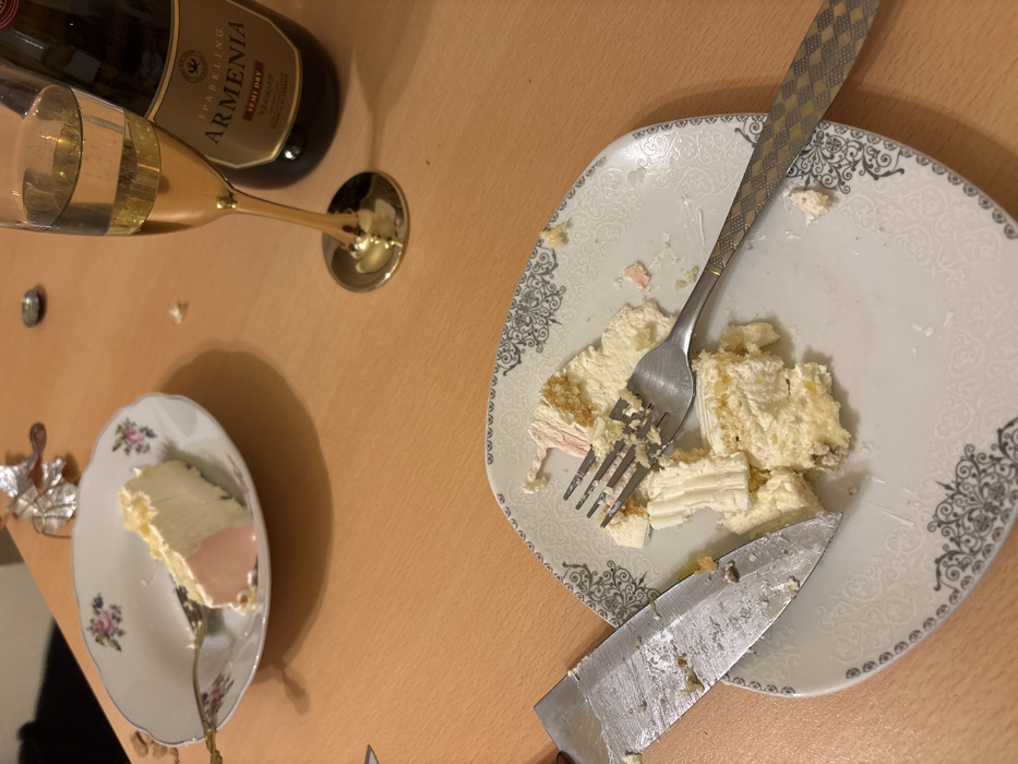 The image displays a table setting. A bottle of "Sparkling Armenia" sits beside a partially consumed glass of a light liquid. A small plate with a slice of cake rests near the bottle. A larger plate holds leftover cake pieces, a fork, and a knife smeared with cream. The table surface is plain and light brown.
