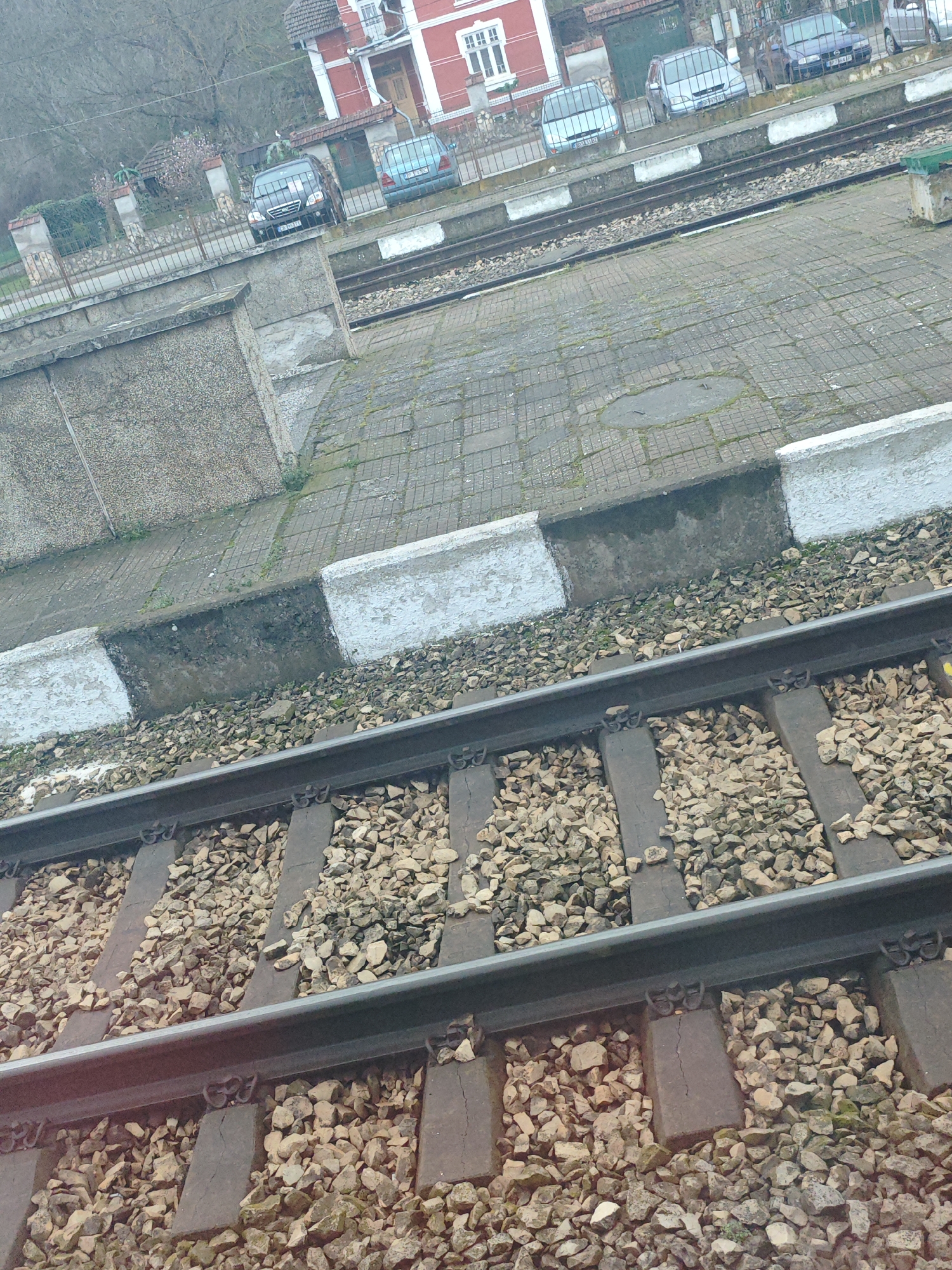 view of railway tracks at a train station in the city of Roman, Bulgaria. The tracks are filled with gravel. Alongside the tracks is a platform made of gray brick. A concrete wall with alternating black and white painted sections runs along the edge of the platform. In the background, there is a parking lot with several cars parked near a red and white building. The sky appears overcast.
