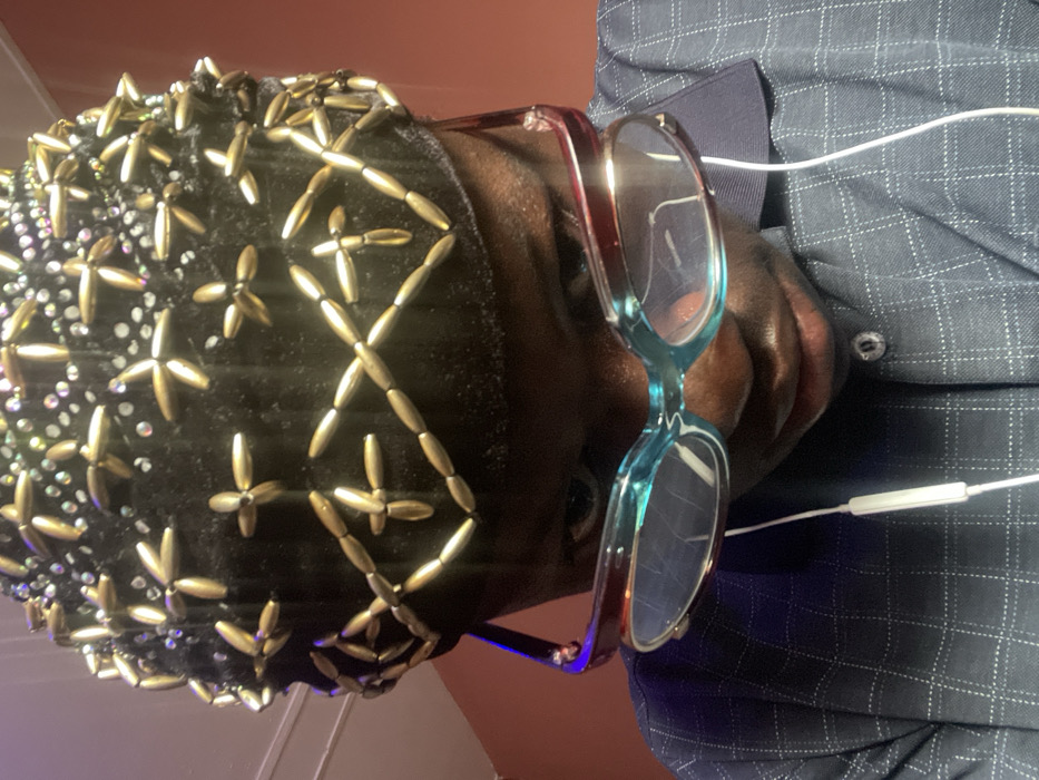A close-up, downward-facing portrait shot in Mosafejaw, Nigeria, features an individual with dark skin. The person wears a dark, possibly velvet, cap heavily adorned with gold-colored, elongated bead-like embellishments arranged in cross and linear patterns, interspersed with small, reflective, clear accents. Below the cap, the individual's eyes are visible, peering over a pair of prescription glasses with distinctive two-tone frames: turquoise-blue on the lower portion and a reddish-maroon on the upper rim. Clear lenses are present. The individual is wearing a dark blue or grey collared shirt with a subtle plaid or checked pattern. A single white wired earphone, with its control module, hangs visibly below the left side of the glasses. The background is out of focus, exhibiting a gradient from a warm reddish-orange tone on the right to a darker, cooler purplish hue on the left.